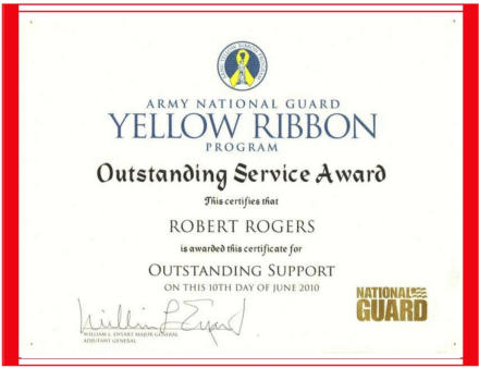 Robert & Tammie were recognized by the Army National Guard for their volunteer work at Yellow Ribbon events where they provided information to returning service members about the use of Service Dogs.
